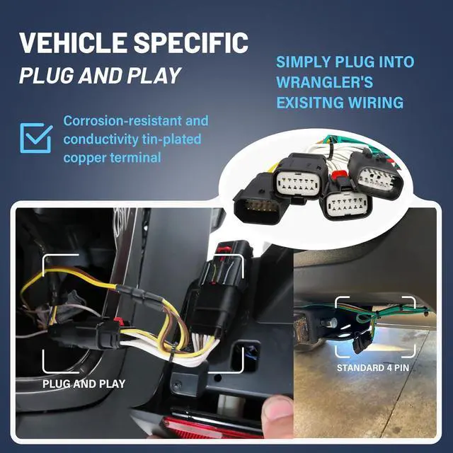 Durable Construction: - This for Jeep Wrangler JLU JL 4xe and Jeep Gladiator JT trailer hitch receiver wiring harness kit construct with heavy duty bonded wire and premium tin-plated copper terminals perform in great corrosion-resistant and conductivity