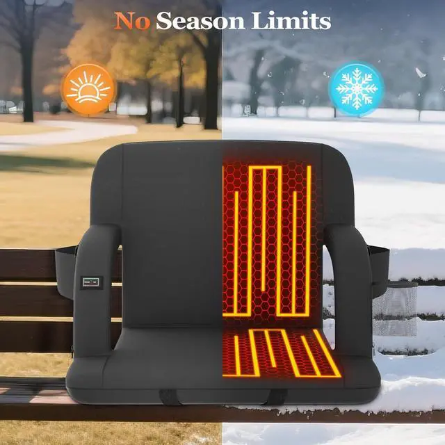 ESSENTIAL FOR OUTDOORS & SPORTS BLEACHER CHAIR. Heated bleacher seat with a backrest is your ideal outdoor companion, turning any activity into a comfortable experience. Whether youre at sporting eventsfrom football, baseball, and basketball games to the Olympics and World Cupor enjoying outdoor outings like picnics, camping, fishing, beach trips, or travel. Extra wide stadium seats with back support is indispensable.