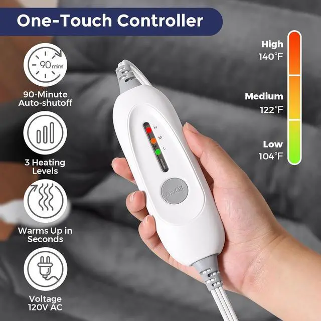 Large Area Heating: The heating pad features dual-zone heating for both the back and seat, providing full-body warmth. With 3 heat settings and a 90-minute auto-shutoff, it ensures safety, energy efficiency, and prevents overheating to avoid burns.