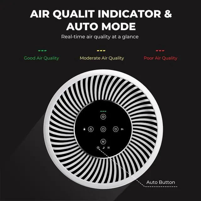 Convenient Operation: Built-in air quality sensor clearly shows indoor air quality status on the panel. In Auto Mode, fan speed adjusts to real-time conditions, purifying the air for your home office, dorm bedroom, or living room.