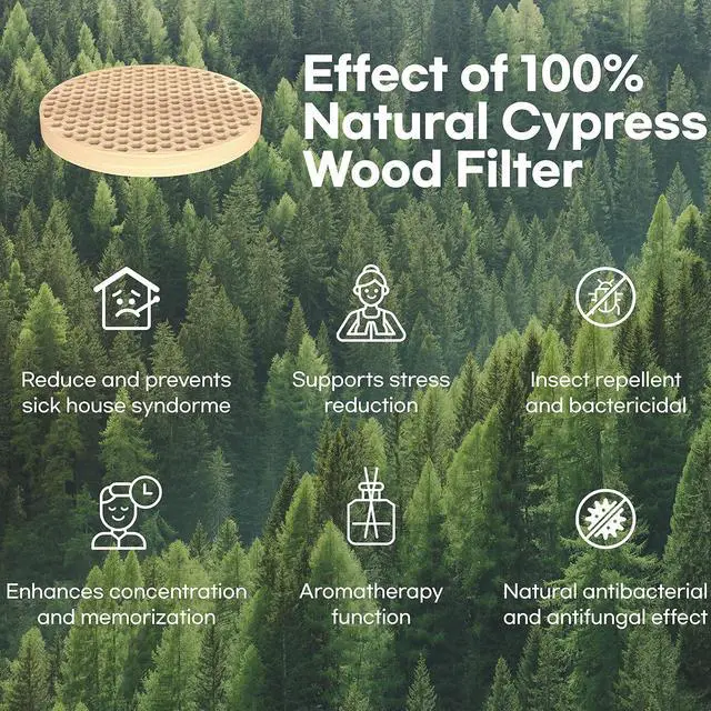 ECO-FRIENDLY AIR PURIFIER WITH CYPRESS WOOD FILTER - The product is a 100% ozone-free product. The cypress filter is made chemical-free. VOVOs air purifiers feature the worlds first 100% cypress filter, providing a natural antibacterial and antifungal effect with aromatherapy, stress relief, and reduced risk of sick building syndrome.