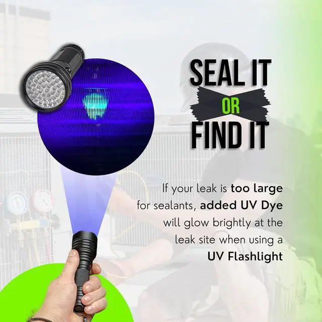 WITH ADDED UV DYE FOR FINDING LARGE LEAKS: Seal it or find it! If you have a leak that is simply too large for leak sealants to seal, the added UV Dye will light up brightly at the leak site when using a UV flashlight.