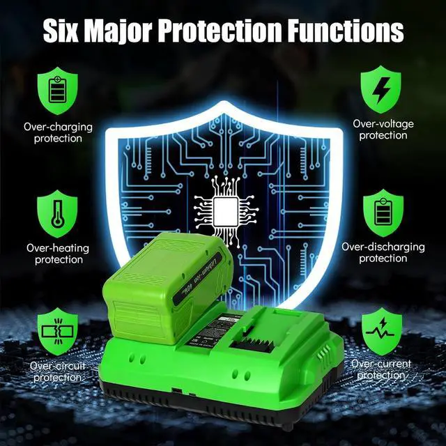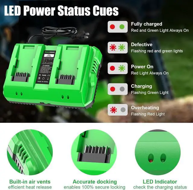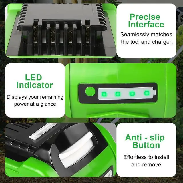 LED Indicators: The battery features 4 LED indicators that display remaining power or charging status at the touch of a button, helping plan work wisely; the charger has a built-in LED indicator showing real-time charging progress for easy tracking.
