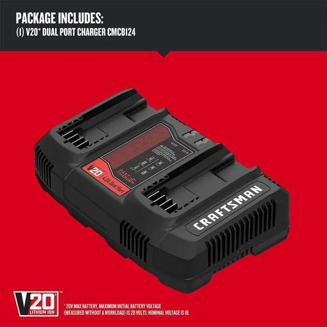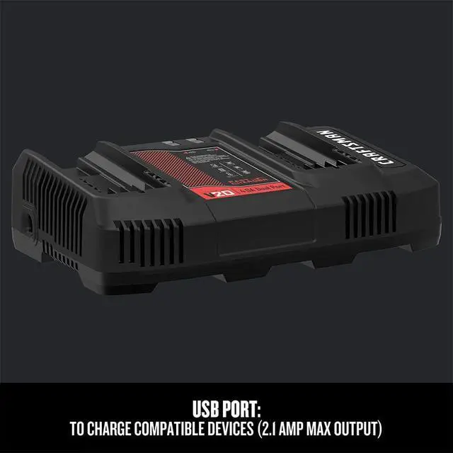 The Dual-Port Charger allows you to charge 2 V20* batteries simultaneously. 20V battery includes one 2.1 Amp max output USB port to charge compatible devices. It also features an LED charge indicator to show charge status.