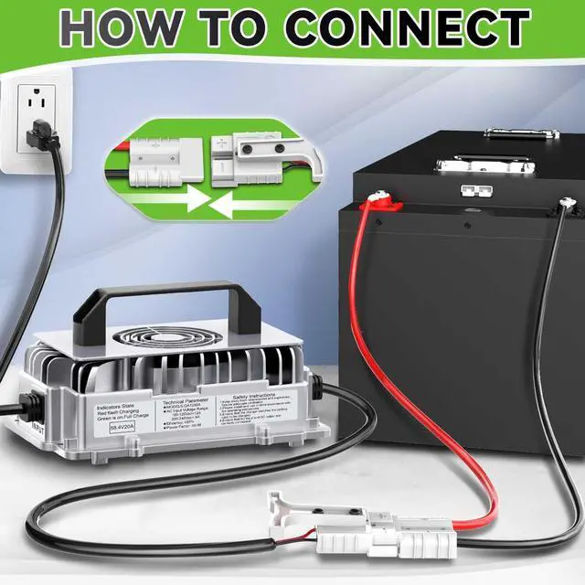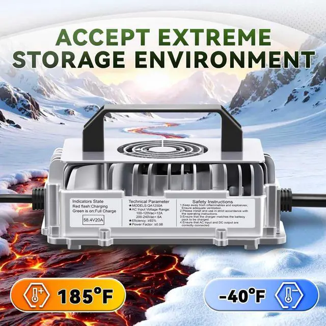 Easy Operation 58.4V 20A lithium battery charger upgraded the connection between the charger and the battery with an M8 terminal and alligator clips, and added a Anderson connector for customer convenience. We have kept the cooling fan to enable the charger to charge more efficiently.