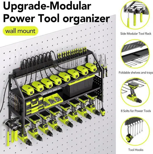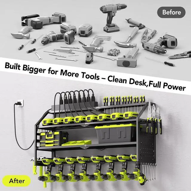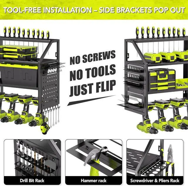 Upgrade Heavy-Duty Garage Tool Hanger: Constructed with premium-quality heavy-duty metal, Loads 400lbs, our four-tier Black garage drill tool organizers ensure exceptional strength, rust resistance, and durability. The solid metal tray and reinforced mesh shelves support all your tools reliably, providing years of dependable service without deformation.