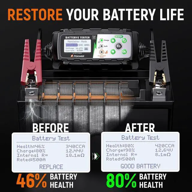 Know Your Battery Health Before Charge with 2-in 1 Charger & Tester Don't waste hours charging a dead battery thats already failed. Unlike standard chargers, BC521 acts as a professional 12V car battery tester, giving you instant LCD data on Voltage, SOH (State of Health), SOC, Cranking Performance and Alternator Output. This digital battery analyzer tells you exactly if your battery is ready for a spring road trip or if its time for a replacementsaving you from unexpected breakdowns and expensive towing fees.
