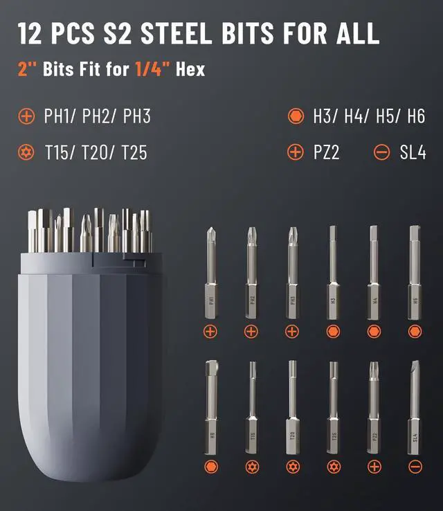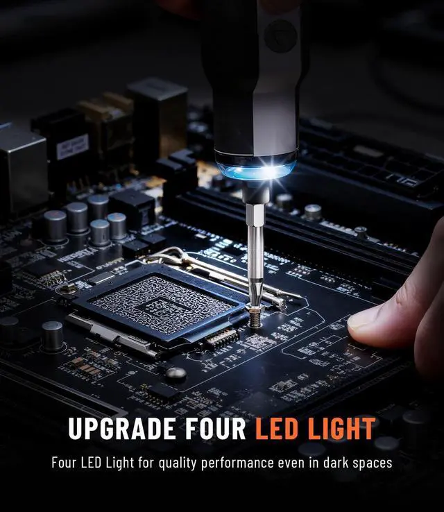 Complete Precision KitIncludes 12 high-quality S2 steel bits (PH/SL/H/T/PZ) stored neatly in a magnetic holder. LED light illuminates work areas without glare. Every accessory thoughtfully curated for makers who value quality and efficiency.