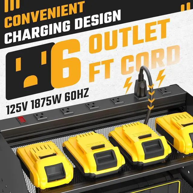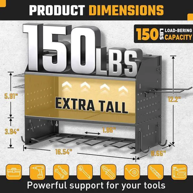Neat & Flexible 4 Drill Holders Garage tool organizer with 8.9" W, 16.5" D, and 12" H. The middle layer of the garage organization rack can be adjusted to accommodate items of varying heights or removed entirely for tailored storage, allowing you to organize your tools and equipment as needed. The tool rack is used in a wide range of applications can be used in tool rooms, garages, workshops, etc., and can also be mounted to the sides of a work van or box truck.