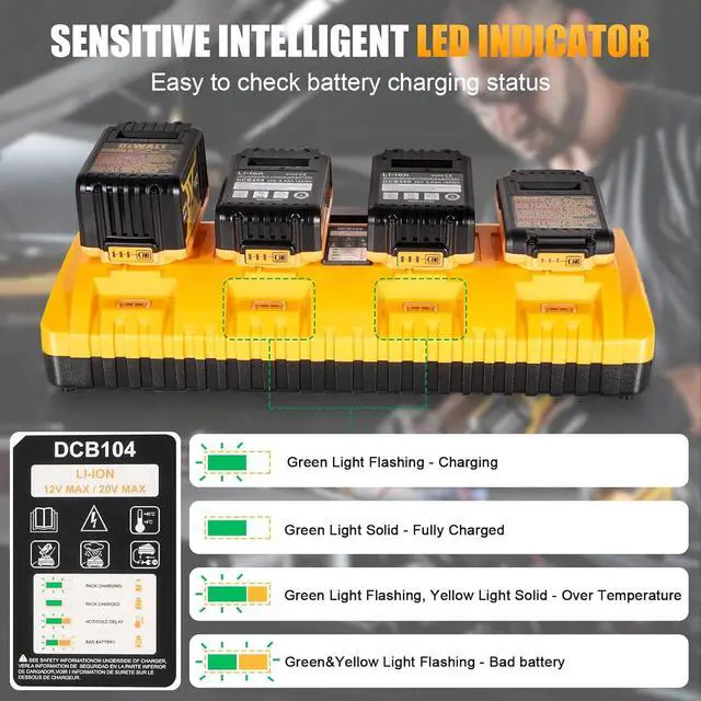 diagnostics flash clear alerts: charging (flashing green), fully charged (solid green), over temperature (green flashing, yellow solid), or abnormal battery (flashing green&yellow). Never risk overheating unplug the moment your dewalt battery charger station signals completion