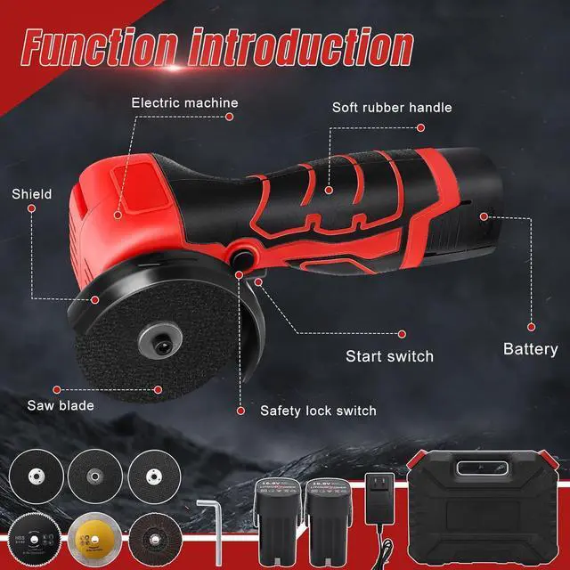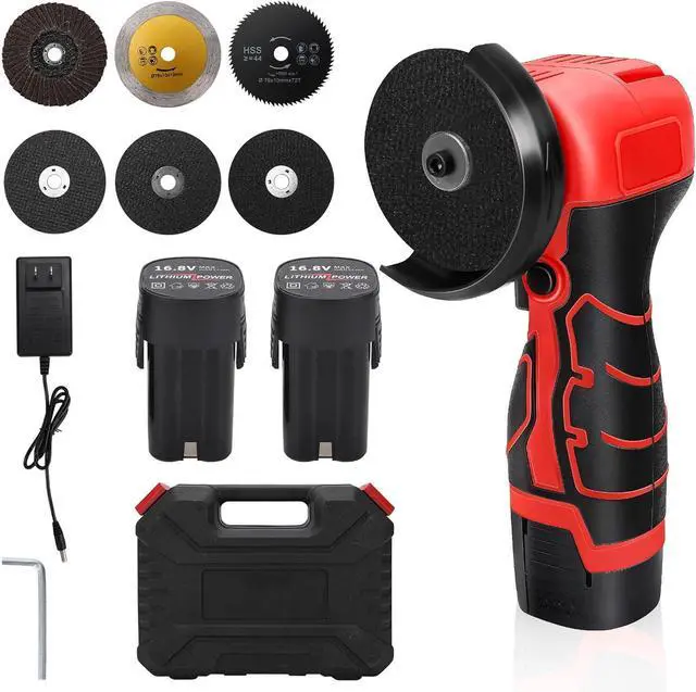 Multifunction Mini Grinder Tool Set Our mini angle grinder tool set contains 1 x mini cordless angle grinder, 2 x 1.5 Ah battery, 1 x adapter, 3 x metal cutting disc, 1 x wood cutting disc, 1 x stone cutting disc, 1 x grinding wheel, 1 x Wrench, 1 x user manual, 1 x plastic box. Suitable for metal grinding, deburring, surface finishing, rust removal and wood cutting. Please note that this product is not suitable for cutting and polishing concrete.