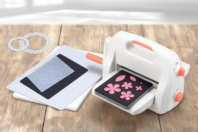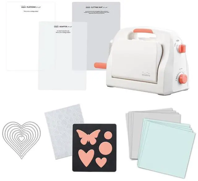 1 Machine 1 Platform1 Cutting Mat 1 Adapter1 2D Embossing Folder( 4.25" x 5.75" )8 Cutting Dies 1 5.5" x 6" Steel Ruled Die1 x 8pcs Pre-cut 6"x 6" cardstock sheets