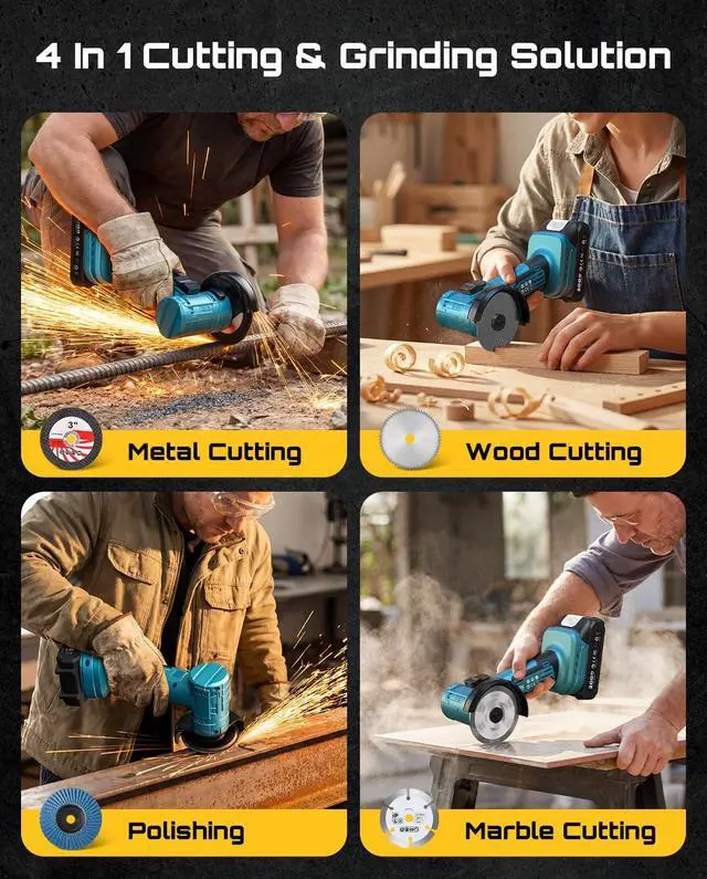 All-in-One Grinding Kit: Cordless Grinder tool package includes 4 cutting blades, 1 grinding wheel blade, 1 saw wood blade, and 1 Stone Cutting blade to handle everything from concrete, and ceramic, to metal and wood surfaces, perfect for quick cutting and grinding tasks anywhere, anytime.