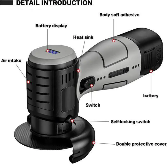 ERGONOMICS/SAFETYSmall angle grinder large area covered with soft rubber parcel, non-slip and anti-drop feel comfortable, to bring you a better using experience. Double thickened filter cover shield, greater prevention of sparks, debris and dust splashes, protect the operator and the battery powered grinder, effectively extend the life of the angle grinder. Ventilation holes in the shell can better dissipate heat during work and prevent the grinder tool from overheating