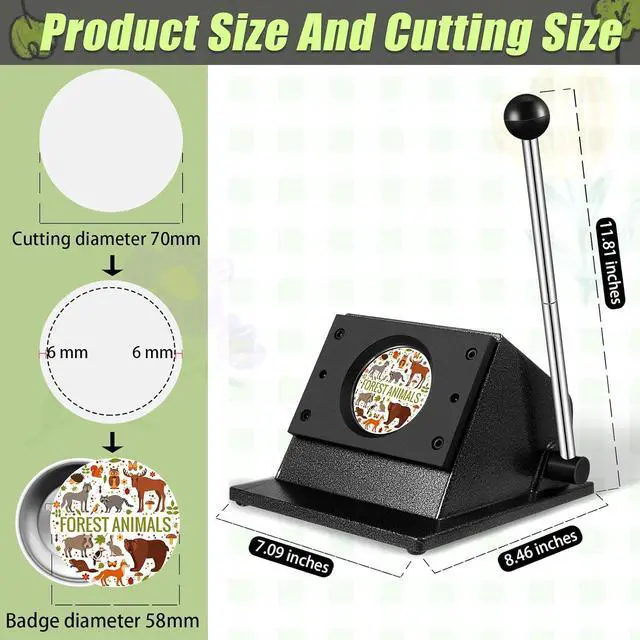 About Dimensions: this tool cuts 2.76 " / 70 mm round paper; If you want to make buttons, leave a margin of 0.236 " / 6 mm between the picture and the circle, then you can use the badge maker to make 2.28 '' / 58 mm buttons