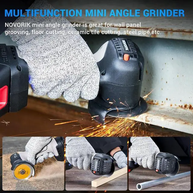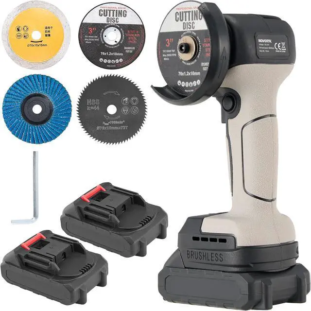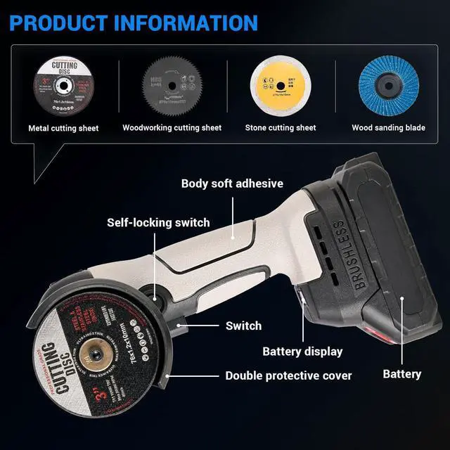 Package Contents/Application WideGrinder tool cordless package includes: 1xCordless Angle Grinder; 6xCutting Wheels; 1xCharger; 1xBattery, 2xWrench and glove. Handheld angle grinder hold can be used for grinding, cutting, sanding and polishing processing of various materials, such as metal, tile, concrete or other solid materials. Small angle grinder can also be used for home improvement, such as cutting and polishing tiles, wood, stone, steel, pipes, conduits, etc.