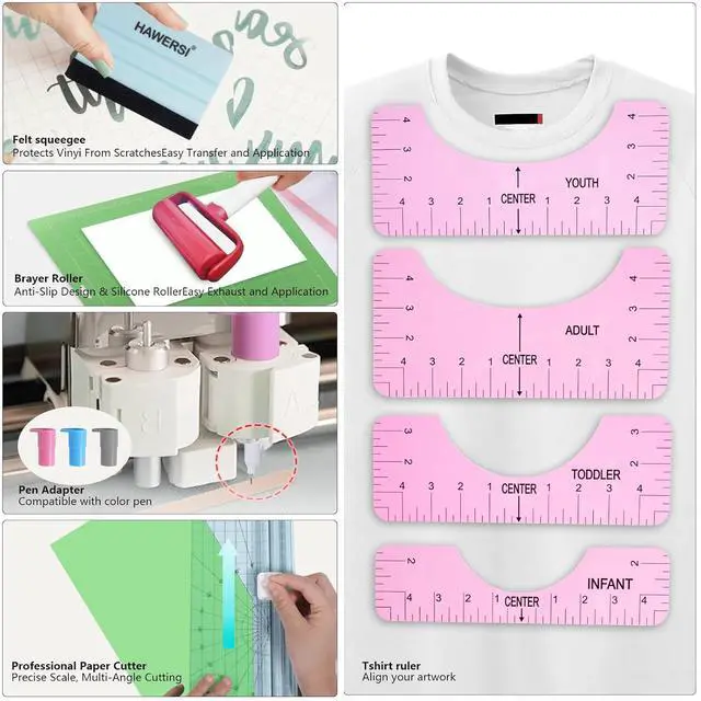 Crict: The brayer roller can flatten your vinyl or paper for better cutting. All pens matched 3pcs pen adapter can be used on crict (not for all the cutting machine), painting, and writing. Essencial 5pcs weeding tool is especially suitable for craft project, allows you to cut, weed, and trim different materials. Exacto Knife for crafts, arts, modeling, scrapbooking, stencil, 4pcs T-shirt ruler can meet your needs of designing multiple sizes for you and your family, and will provide great help for your heat transfer design positioning