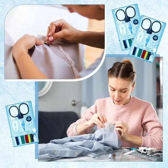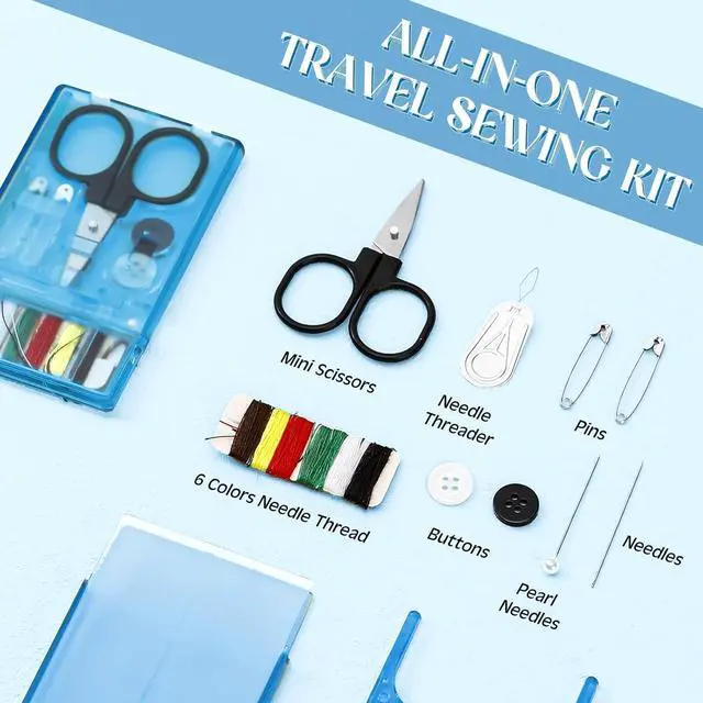 You will receive 100 blue transparent mini portable sewing kit, including scissors, buttons, pins, sewing needles, needle threaders with whiskers, pins, 6 colors of sewing threads, to meet your daily sewing needs and emergency sewing situations