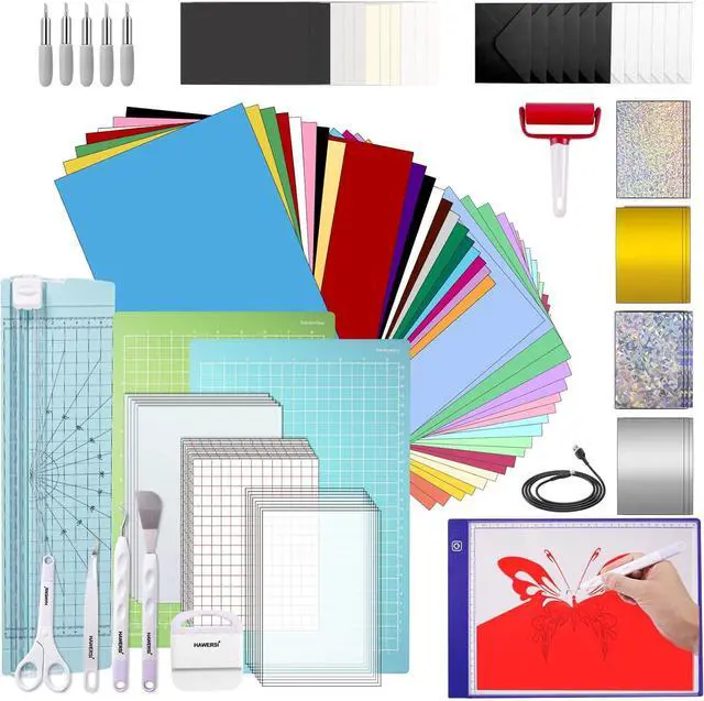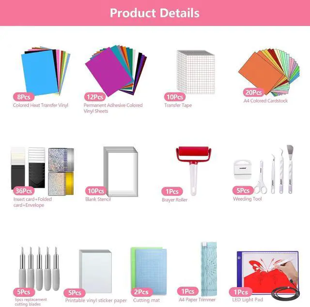 • All-in-one Kit:Accessories bundle for joy xtra includes everything you need to create craft projects,including 12pcs permanent adhesive vinyl,8pcs heat transfer vinyl,10pcs transfer tape,5pcs printable vinyl sticker paper,12pcs card,12pcs folded card,12pcs envelope,2pcs cutting matlight&standard grip),5pcs basic weeding tool set,5pcs joy xtra replacement blade,20pcs A4 cardstock,1pcs brayer roller,10pcs stencil sheets,1pcs paper trimmer,1pcs light pad,your premier choice for crafting freedom