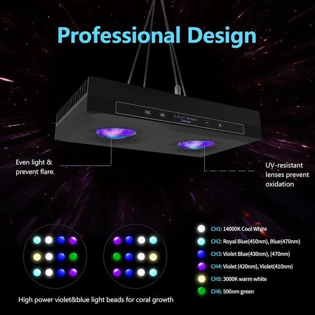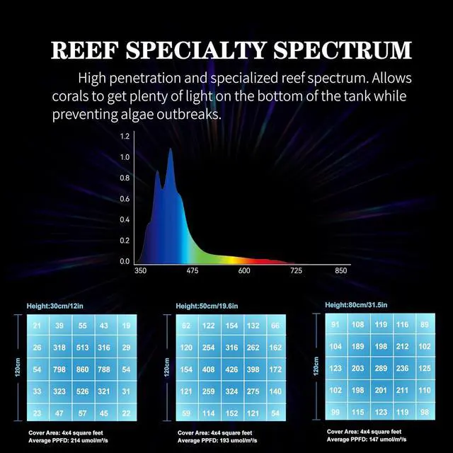 BETTER HEAT DISSIPATION & NO NOISE -Smart two-rollers silent temperature control fans ensuring optimal LEDs' working conditions. Noise standards is lower than 44.7 db (A), fast heat transfer and create you a comfortable environment. G5 is very good coral lights for saltwater tanks