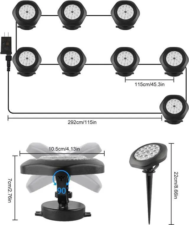 Easy To Use & 2 In 1 Installation: LED underwater submersible light head can be adjusted 90°. There are 18 LED beads in one light, the super bright upgraded version is designed with a convex lens for brighter light. The distance from the plug to the first light is 9.8 ft/3m, the distance between two lights is 3.2 ft/1m. more flexible and convenient to use. Comes with matching accessories, the base can be fixed in the water as an underwater light, or can be installed on the ground or wall as a landscape light, both ways, suitable for pools, ponds, gardens, paths roads and other decorative lighting.