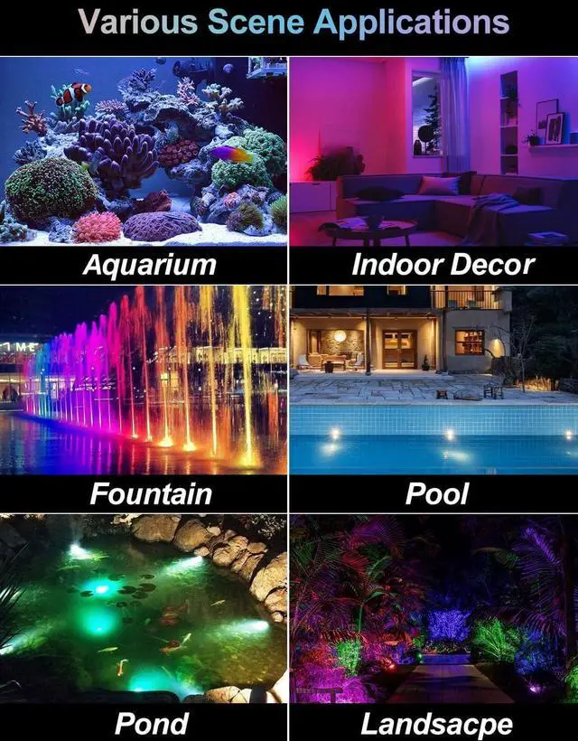 APP Control & Remote Control: This bright LED submersible light has 16 million colors and multiple scene lighting modes, multiple color changing modes, fixed color modes, music modes, timers, etc. 130ft control distance to meet your various needs. You can precisely customize any mode and color you like to create an elegant and vibrant water scene atmosphere. The included remote control allows you to adjust speed/brightness, on/off, adjust color/mode, timer for 30 minutes/1 hour.