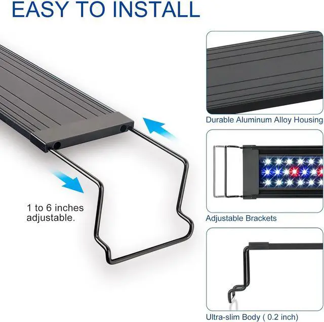 Ultra Slim Aquarium Light with Extendable Bracket: Sliding brackets allow quick and easy adjustments to fit most rimless and framed aquariums. Each side is 8 inches extendable.