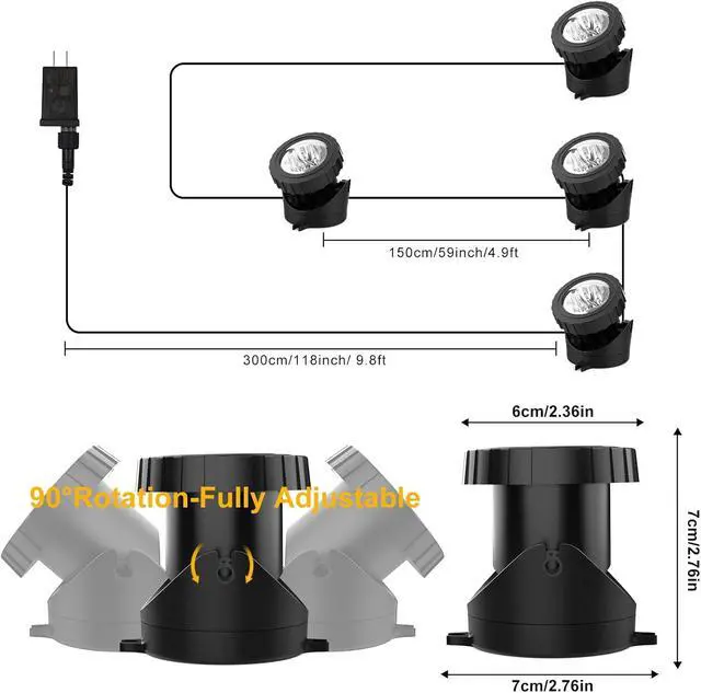 Easy To Use & 2 In 1 Installation: LED underwater submersible light head can be adjusted 90°. There are 6 LED beads in one light, the super bright upgraded version is designed with a convex lens for brighter light. The distance from the plug to the first light is 9.8 ft/3m, the distance between two lights is 4.9 ft/ 1.5 m. more flexible and convenient to use. Comes with matching accessories, the base can be fixed in the water as an underwater light, or can be installed on the ground or wall as a landscape light, both ways, suitable for pools, ponds, gardens, paths roads and other decorative lighting