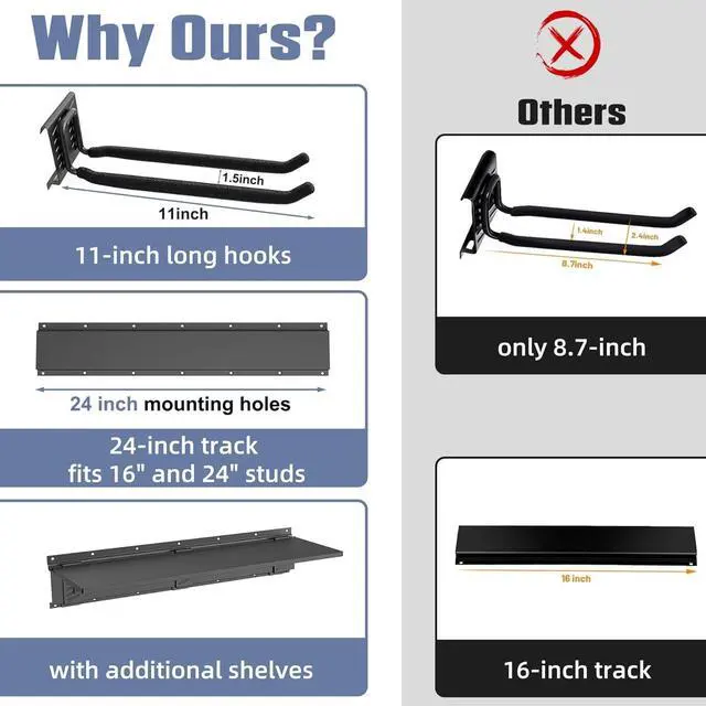 Easy Installation: Comes with four 24" tracks featuring pre-drilled 16" and 24" mounting holes for secure installation on standard 16" and 24" wall studs. Arrange the tracks to best fit your space