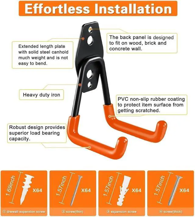 Easy Installation & Easy to Get Started Although Jack is not good at professional installation, he found that the installation of heavy-duty garage hooks are very simple. store gives away 4 different types of screws, each with 64 pieces. Just use the included screws to fix the hooks to the wall. He quickly completed the installation and began to enjoy the convenience brought by the hooks. This made him more confident to complete the garage organization work, and now his garage has a brand new look.