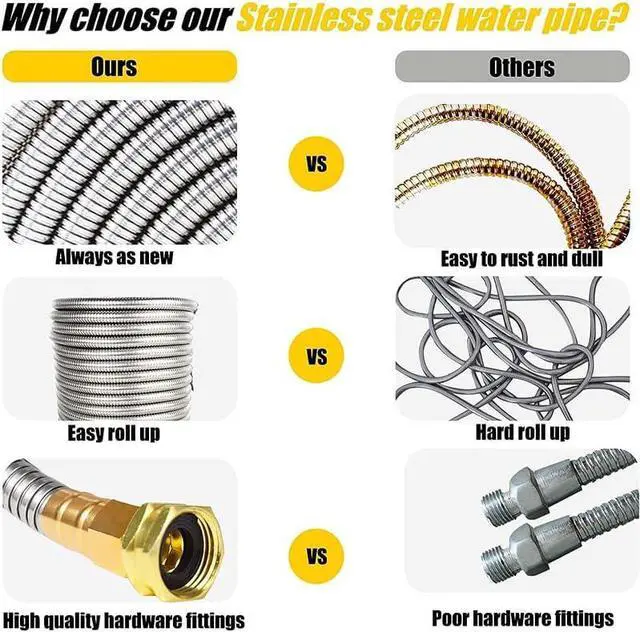 Long service life This type of hose is very durable, containing nickel and chromium, and has corrosion-resistant properties The pipes look as good as new all year round. The sturdy outer 304 metal makes the hose very sturdy, even resisting sharp corners or dog chewing.