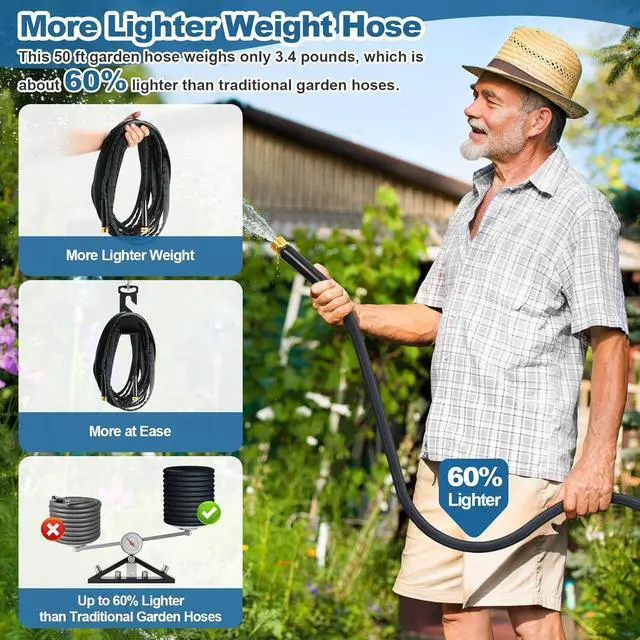 Easy to Store and Use: This flexible hose doesn't generate excess torque, so it won't twist, or tangle during use. If the hose does accidentally get tangled, it's easy to untangle, saying goodbye to traditional hoses that easily get twisted. At the same time, the hose is very lightweight, takes up very little storage space, and is very easy to organize and store. This no-kinking water hose 50ft can bring you a relaxed and pleasant user experience.