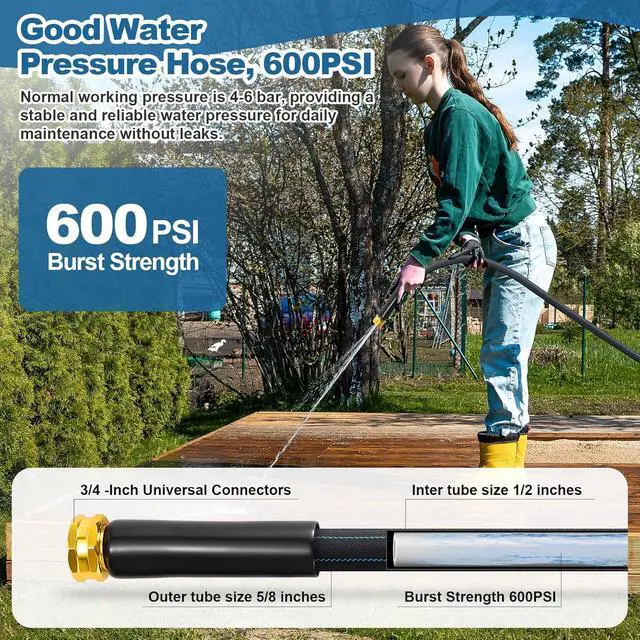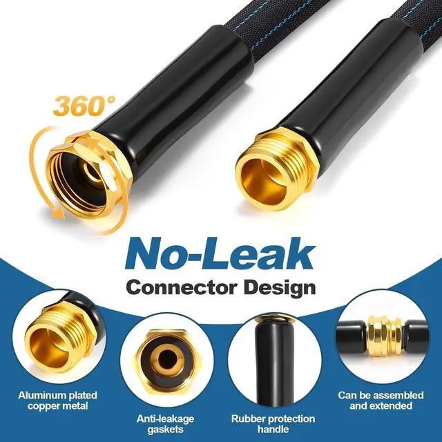 Water Pressure: The water hose 50 ft is made of copper-plated aluminum at both ends, offering excellent pressure resistance and preventing damage. We have configured 3 spare high-strength leak-proof washers (for the female connector) to ensure that the flex hose do not leak. Furthermore, the yard hose has a burst water pressure of 600 PSI, with a recommended daily operating pressure of 100 PSI, providing a stable and reliable water pressure for daily maintenance without leaks.