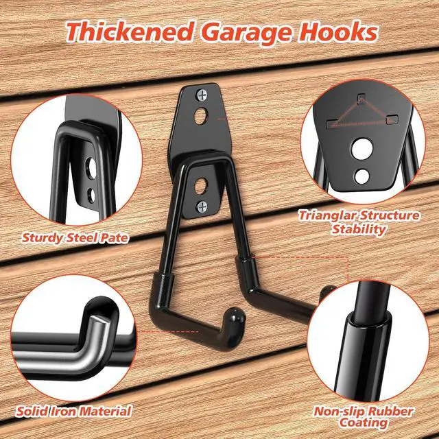 DURABLE AND STURDY: Our heavy-duty garage hooks are crafted from solid steel, making them resistant to bending and deformation. They feature a non-slip PVC rubber coating on the surface, which is not only waterproof and rustproof but also provides a strong grip, ensuring no scratches on the surface of items. Made of thickened plates, the back plate is further reinforced with a three-point welding process, which further enhances their durability and sturdiness