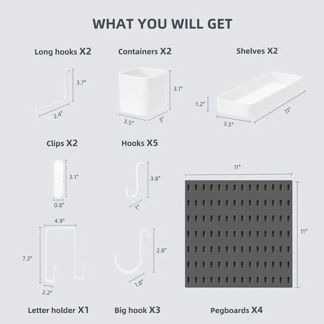 Package Includes - With our pegboard panel kit you will get four pegboard panels each with 11" x 11, two shelves 11" x 3.5" x 1.2", two containers 3.5" x 3" x 3.1", one letter holder 7.3" x 4.9" x 2.2", two long hooks 2.4" x 3.7", five hooks 1" x 2.4", three big hooks 1.8" * 2.8" and two clips 0.8" x 3.1".