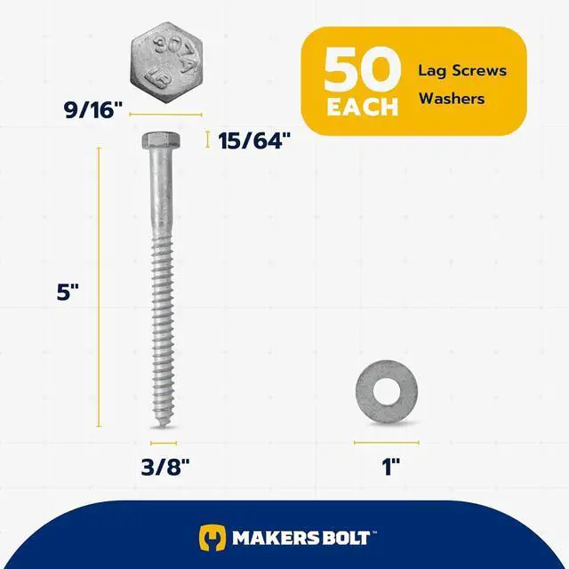 3/8 x 5 (50 Pack) Lag Screw Kit, 50 Screws and 50 washers, Hot Dip Galvanized, Meets ASME B18.2.1 Industrial/Commercial Grade by