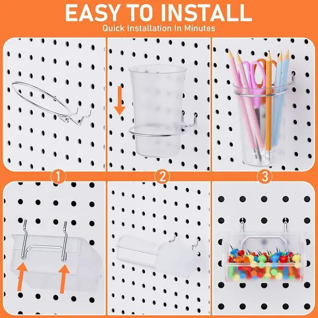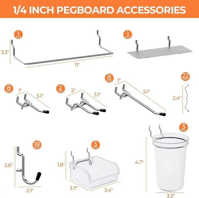 INCH PEGBOARD HOOKS: The peg board hooks are made of hardened steel construction to provide maximum strength, more sturdy and corrosion-resistant. Made of harder and thicker plastic, the pegboard bins and cups are installed with exclusive hooks to hang, sturdy for long time use
