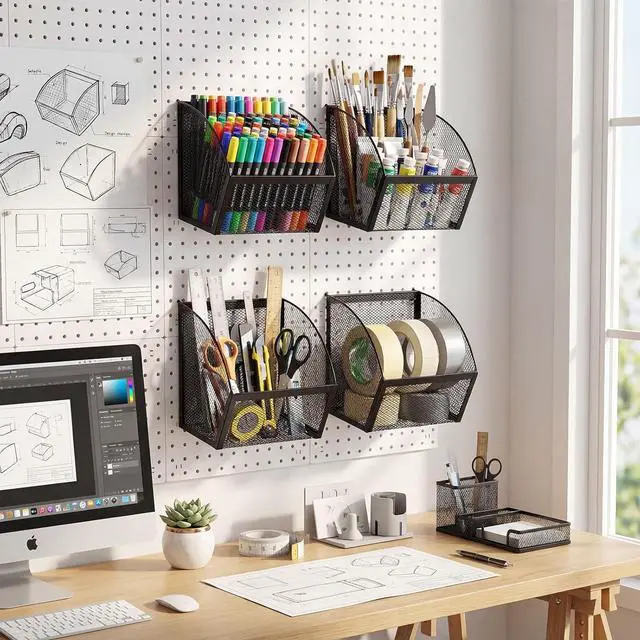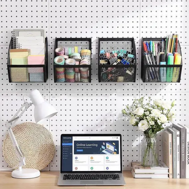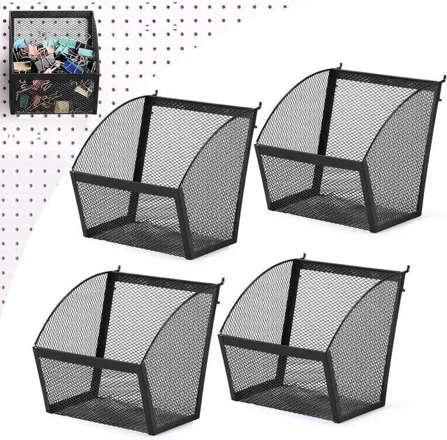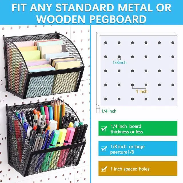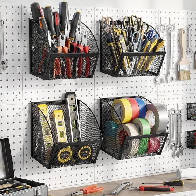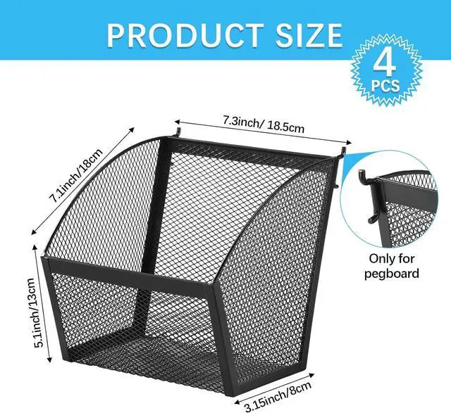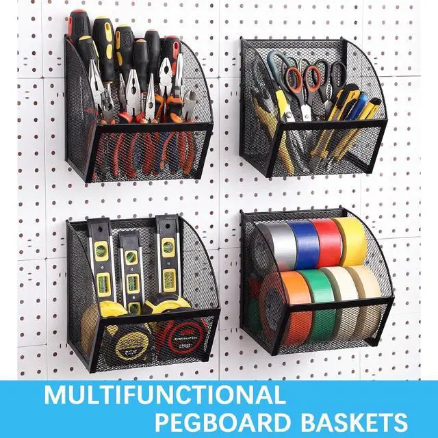 Applications: the pegboard baskets provide a dynamic range of uses; From the kitchen to the garage or office, these baskets can be utilized to sort and store various items such as tools, household products, stationery, and much more