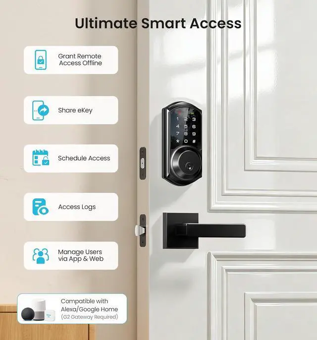 Remote Access & Voice Control: When paired with G2 gateway (sold separately), smart deadbolt door lock integrates with smart home systems, allowing you to remote lock/unlock, real-time access logs, battery monitoring, user management, and abnormal alerts and works with Alexa and Google Assistant voice commands, even when you are busy or away from home