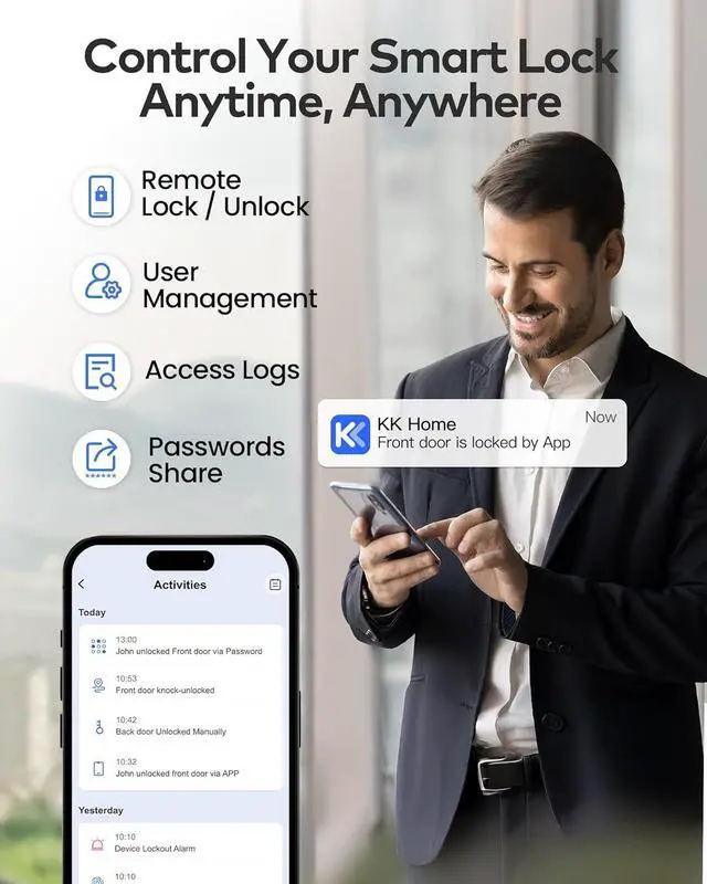 Long-Lasting Battery & Low-Battery Indicator: Powered by 8 AA batteries (not included), delivering up to 8 months of battery life with normal use. The KK Home App sends low-battery alerts when power drops below 20% to prevent unexpected lockouts