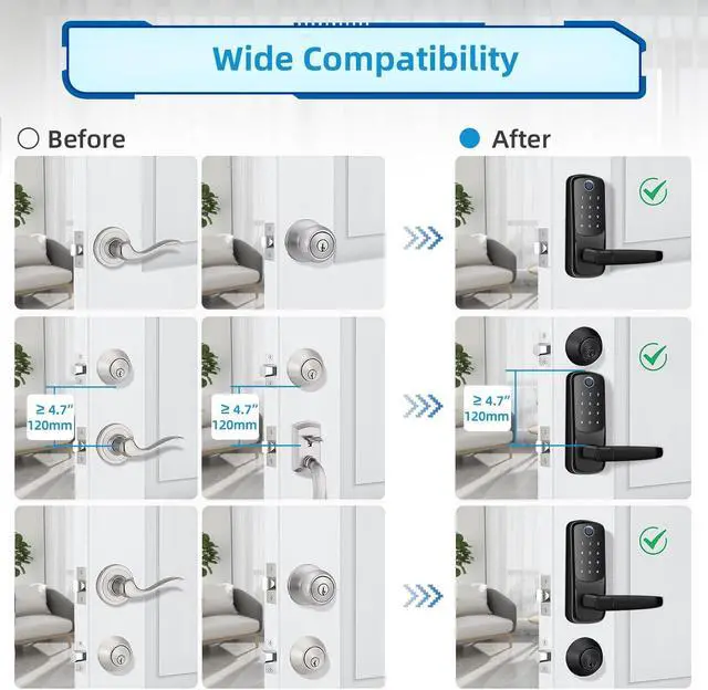 Easy InstallationInstall in a flash without Extra Drilling, keyless locks Perfect for American front doors. Just need a screwdriver, you can install electronic door lock within 10 minutes, no need for costly locksmith services. Quickly replace your existing front door handle, levers, door knobs, deadbolts or locksets. Reversible handle fit both left and right handed doors