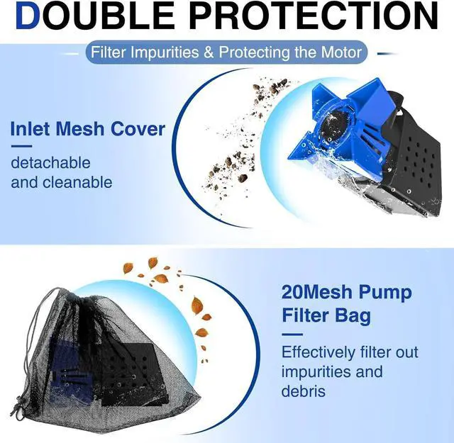 Superior Design - This water pump has a 33FT ultra long power cord, which can meet various distance requirements; Two nozzle adapters are suitable for various sizes of water pipes, making connection more convenient. The large inlet grille on the pump body, combined with an additional filter bag, can prevent impurities from being sucked in, and is detachable for easy cleaning, effectively protecting the motor and greatly extending the service life of the machine.