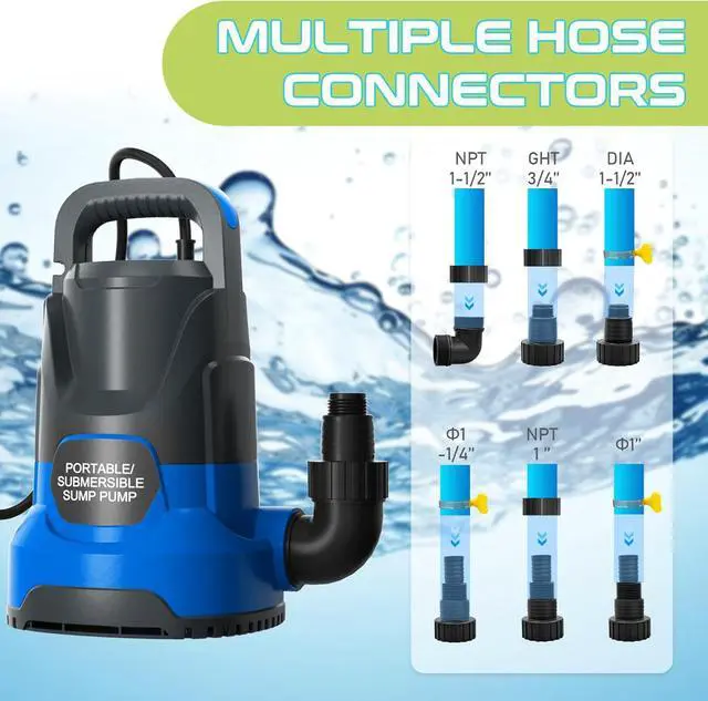 Connect: Includes adapters for NPT 1-1/2" discharge hose, GHT 3/4" garden hose and an adapter suitable for 1-1/4", 1", or NPT 1" hose. (1-1/2'' discharge hose is recommended for better water flow effect)