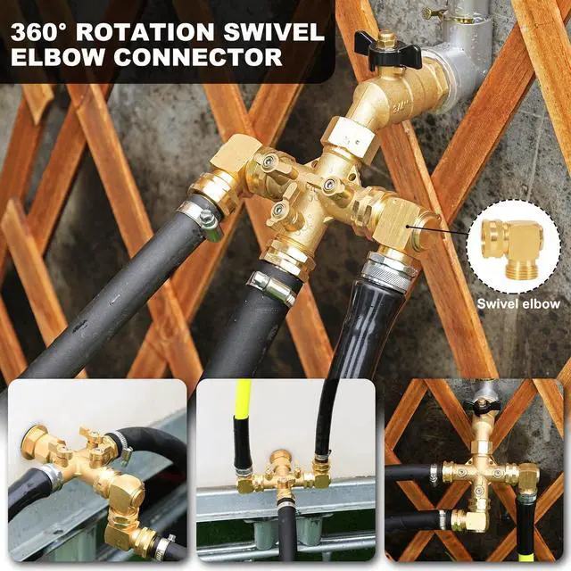 Connect: 3/4" GHT Famale threaded inlet Connection and 3 way High Flow 3/4-inch GHT male threaded hose end outlet Connection. Garden Hose Splitter with Swivel elbow Connector are widely used for watering plants, flowerbeds and washing your carThe Swivel elbow design prevents the garden hose from kinking and Change the direction of the hose.
