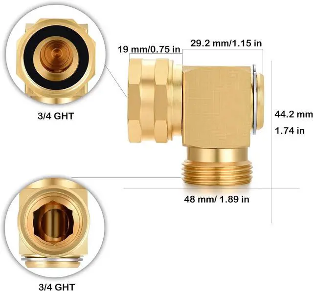 Dimensions & Connect: 3/4 inch GHT Internal Thread to 3/4 inch GHT External Thread, Double elbow connection can achieve three -dimensional space changes in direction Eliminates Hose Crimping and Straining at Faucets and Water Connections.