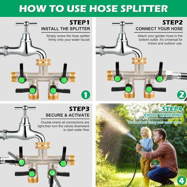 4 Way Brass Hose Splitter, Universal Fit & Easy Leak-Proof InstallationDesigned For A Standard Garden Faucet, Hose Bib, Or Spigot, This Garden Hose Splitter Installs In Seconds Without Tools. The Integrated Washer Creates A Tight Seal For A Leak-Proof Connection Right Out Of The Box. It'S The Perfect Garden Hose Connector And Faucet Splitter For A Hassle-Free Setup. "