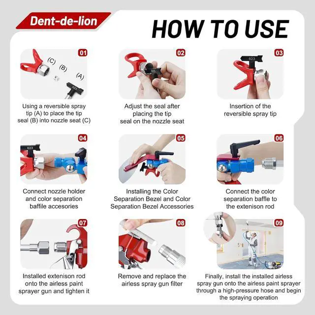 follow the steps below: first, install the filter into the airless spray gun; then, insert the tip seal into the nozzle; then, place the nozzle into the protective base; finally, rotate and secure the nozzle. After completing the above assembly steps, rotate the airless sprayer into place and you are ready for the spraying project. (Please refer to the pictures for detailed installation steps