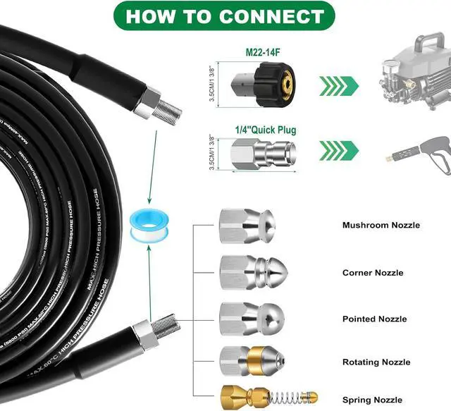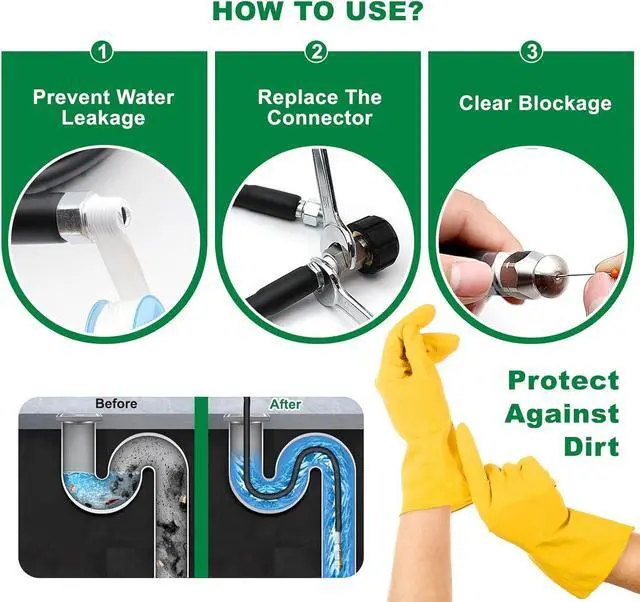 WIDE APPLICATION: Our high-pressure drain cleaning hose is designed for both unclogging and everyday cleaning. It effortlessly clears blockages in sinks, drains, gutters, and toilets while as a powerful cleaner for vehicles, floors, driveways, and other indoor/outdoor surfaces. 2 spanners for quick nozzle and coupler installation, pearl corsage pin can help to clean the nozzle blocking, waterproof tape to help prevent leaks, and gloves to protect your hands during operation