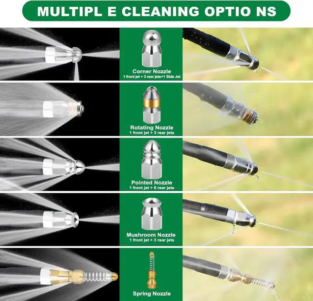 5 different nozzles: mushroom nose clears blockage and flush out debris, rotating nozzle offers an even cleaning and flushes out debris, corner nozzle can clear blockages at the corners, the fixed nozzle is used to dredge the sewer pipe that needs to be turned. More powerful and unique nozzle suitable for sewer clogging to provide better results