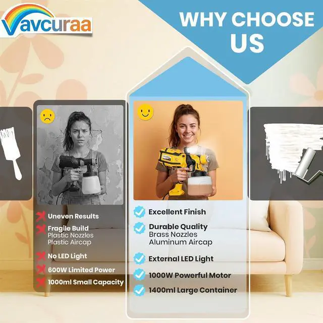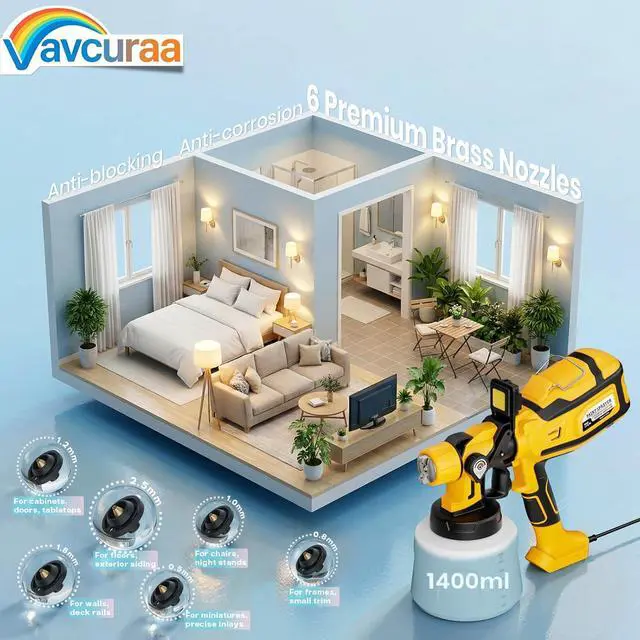 6 Copper Nozzles & Adjustable Flow Control Paint Sprayer for House Painting with 6 copper nozzles ( 0.52. 5mm) to handle detailed furniture work or broad wall coverage. Adjustable flow rate up to 1200ml/min ensures full control for different paint thickness (100 Din/s). Perfect paint sprayer for furniture, cabinets, doors, fences, and more.